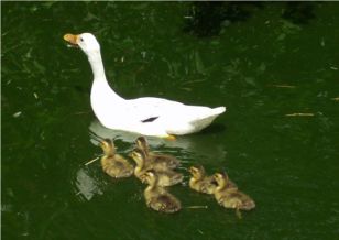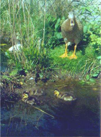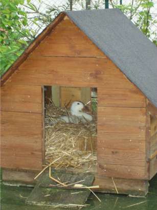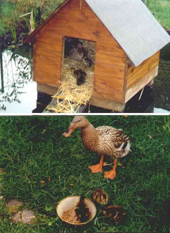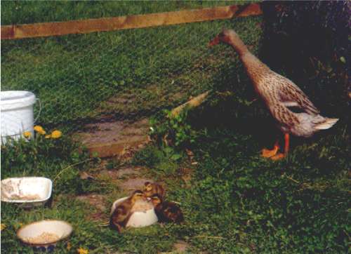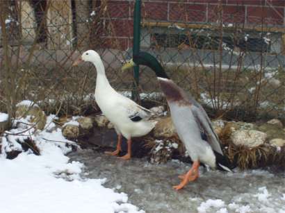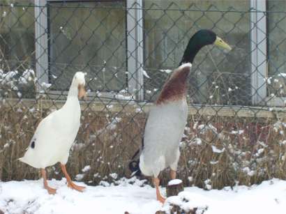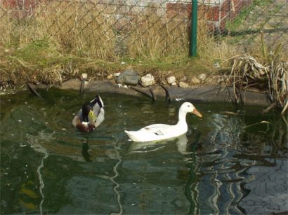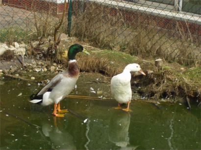 Hier siehst du unseren Enterich mit seiner Frau. Der Enterich kam 2002 bei uns auf die Welt. Du kannst ihn weiter unten als Küken betrachten. Die weiße Ente haben wir erst seit Weihnachten 2002, weil ihre Vorgängerin plötzlich verstorben ist. |