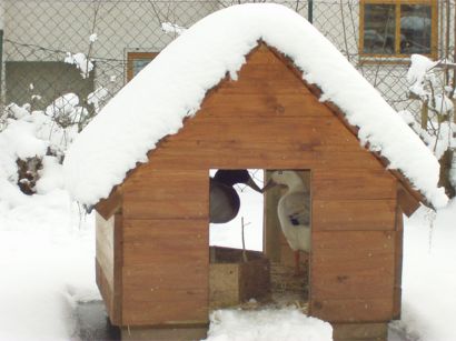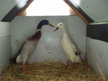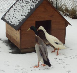 Wenn der Weiher zugefroren ist, kommen die Enten nachts zum Schutz vor Mardern in den warmen Stall. |